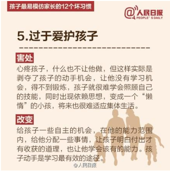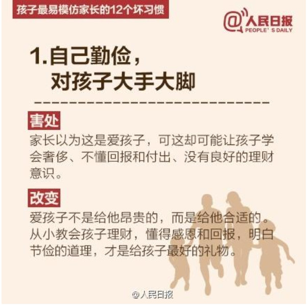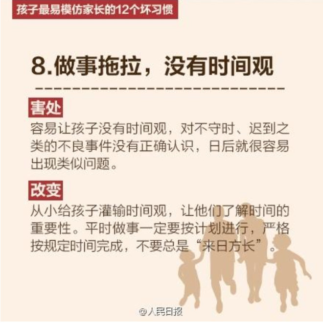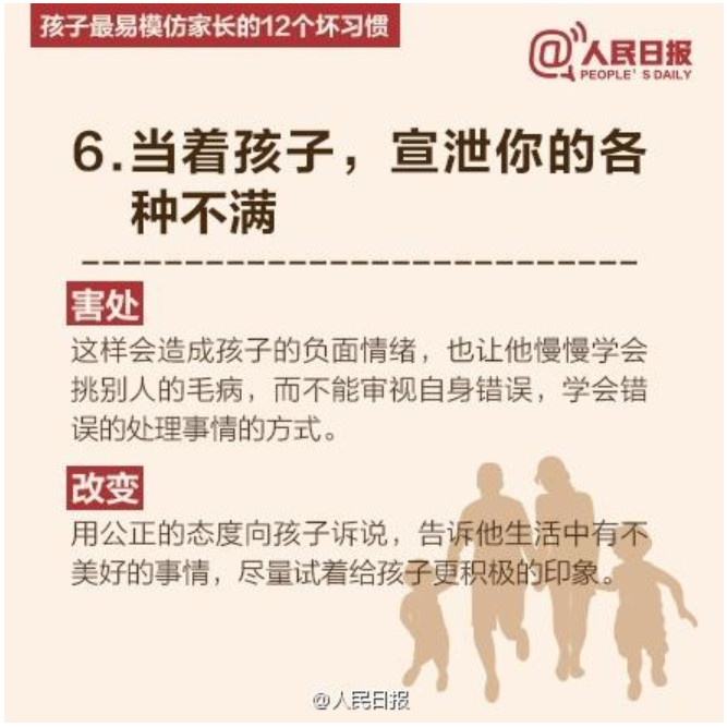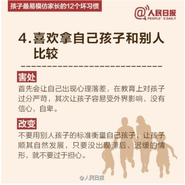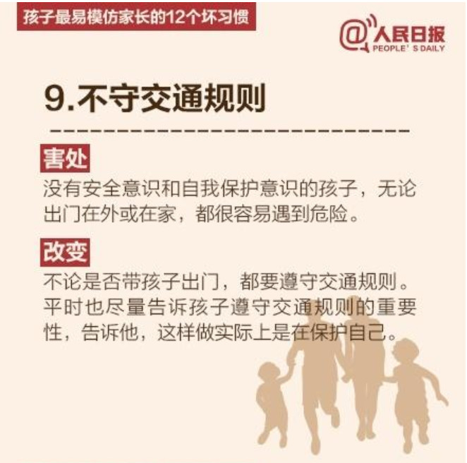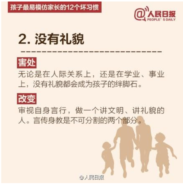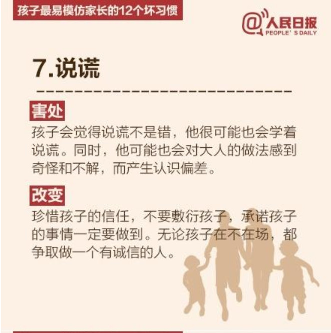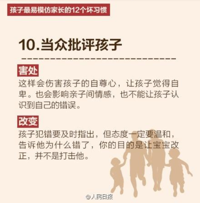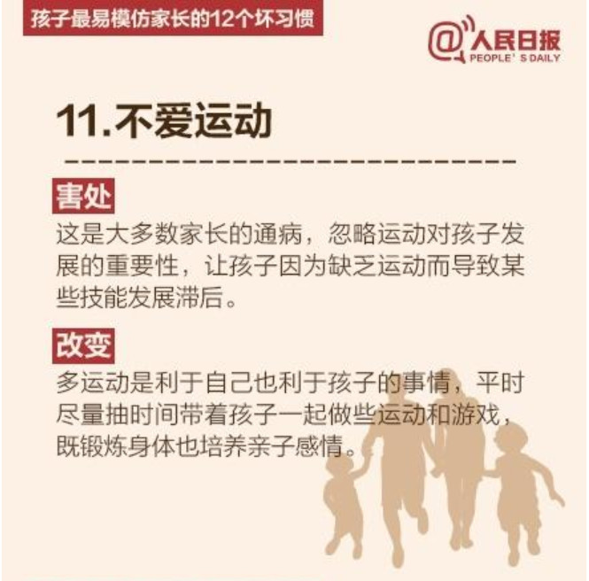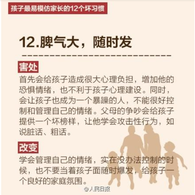 人民日报列出了孩子最易模仿家长的12个坏习惯,老师们提醒家长要注意了哦。