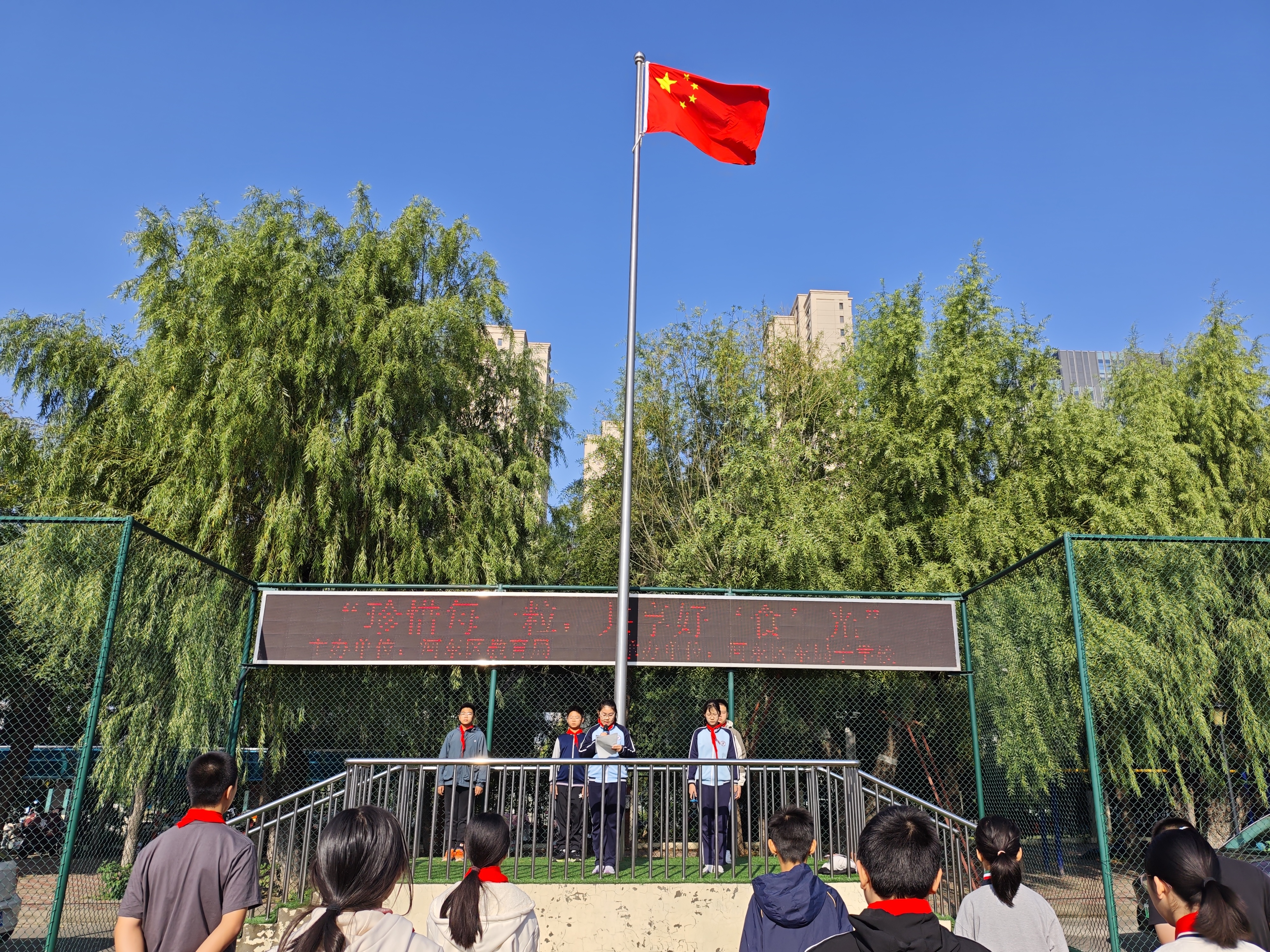 晨光遍洒绿茵操场,节约新风随五星红旗一同迎风而起。2025年10月13日,东局子学校以“珍惜每一粒,共享好食光”为主题举行升旗仪式,全体师生齐聚操场,共抒节粮情怀、同筑勤俭新风。本次仪式旨在深度传承中华民族爱粮节粮的传统根脉,强化学生对粮食生产“春种秋收、颗粒皆辛”的认知,引导学生将节粮自觉内化为日常行为准则,培育尊重劳动、珍惜资源的优良品格。