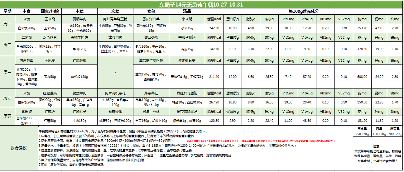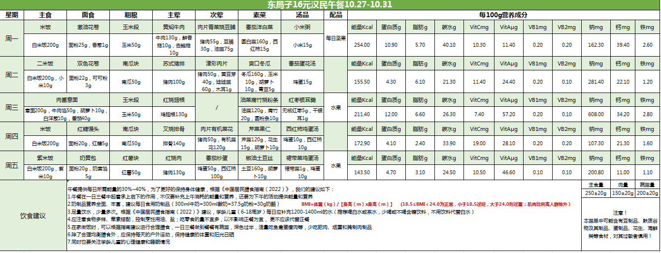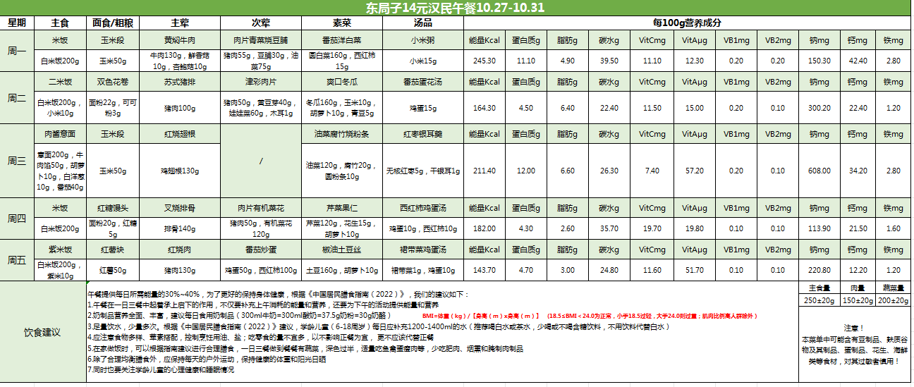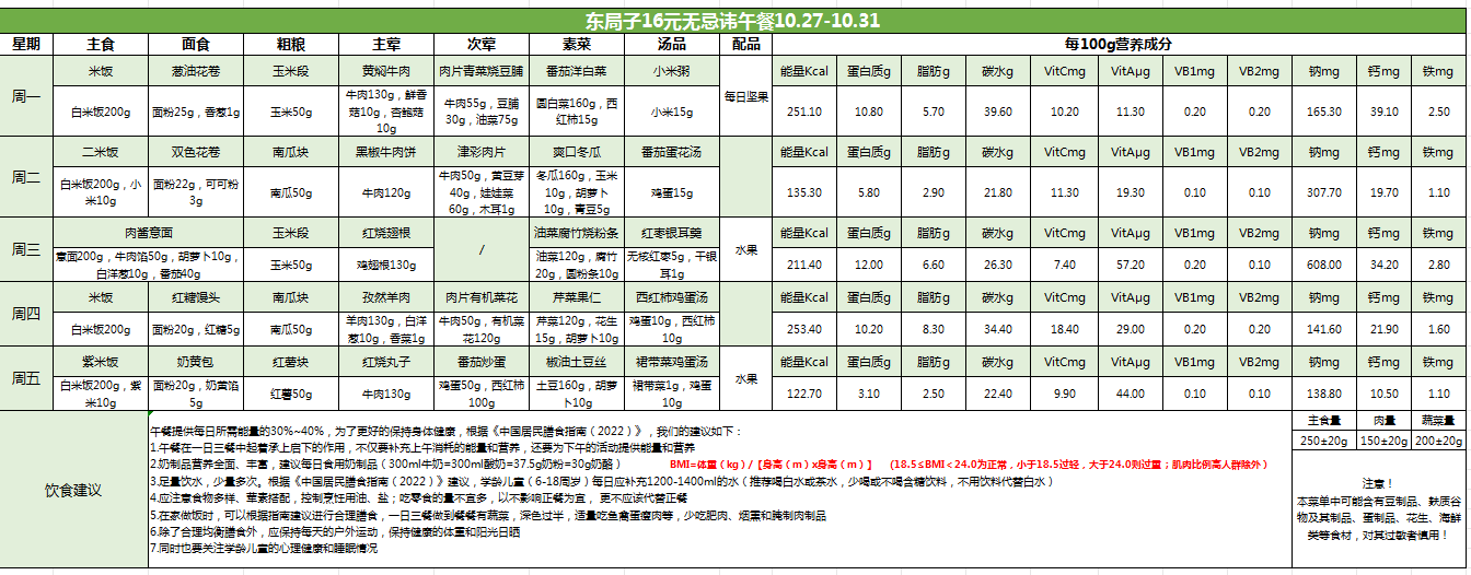 东局子学校午餐餐单公示(10.27-10.31)