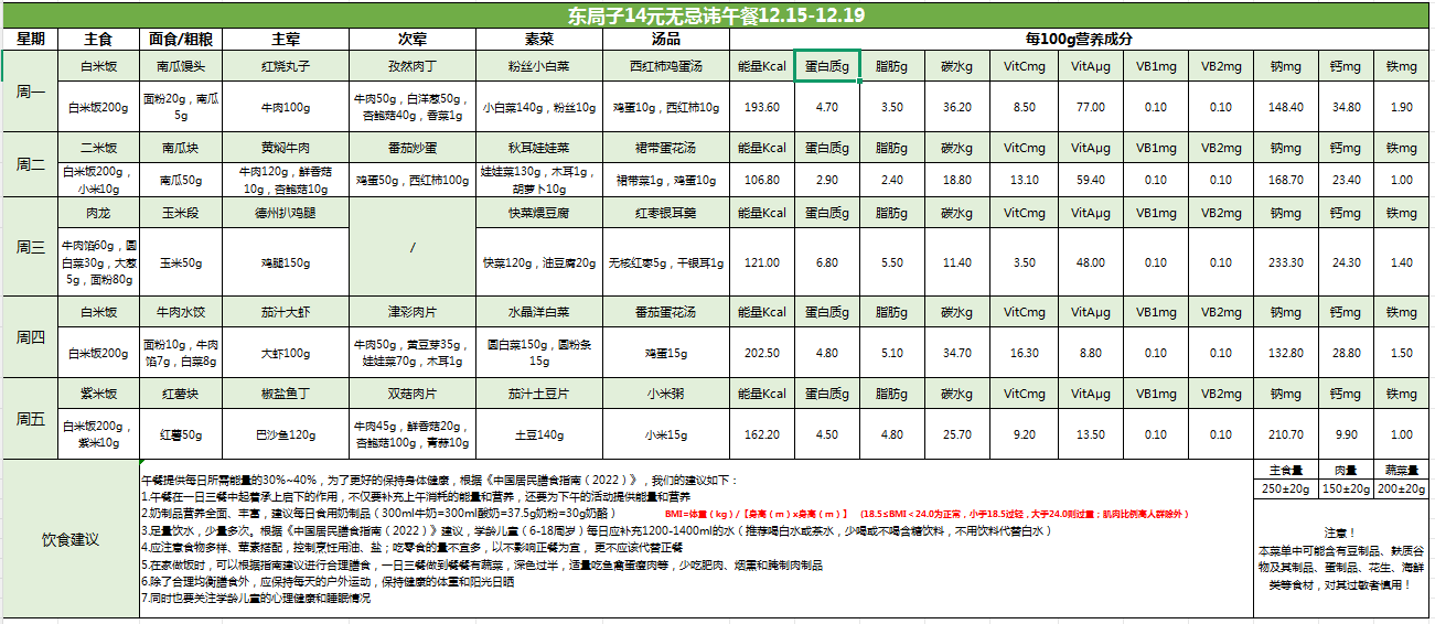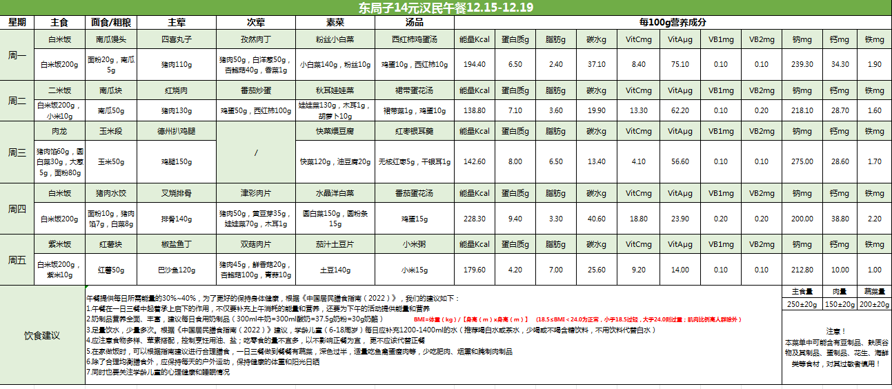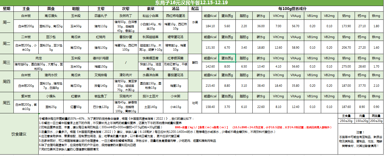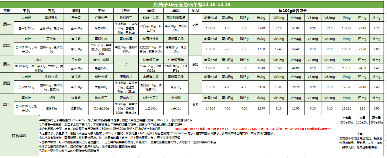 东局子学校午餐菜单公示(12.15-12.19)